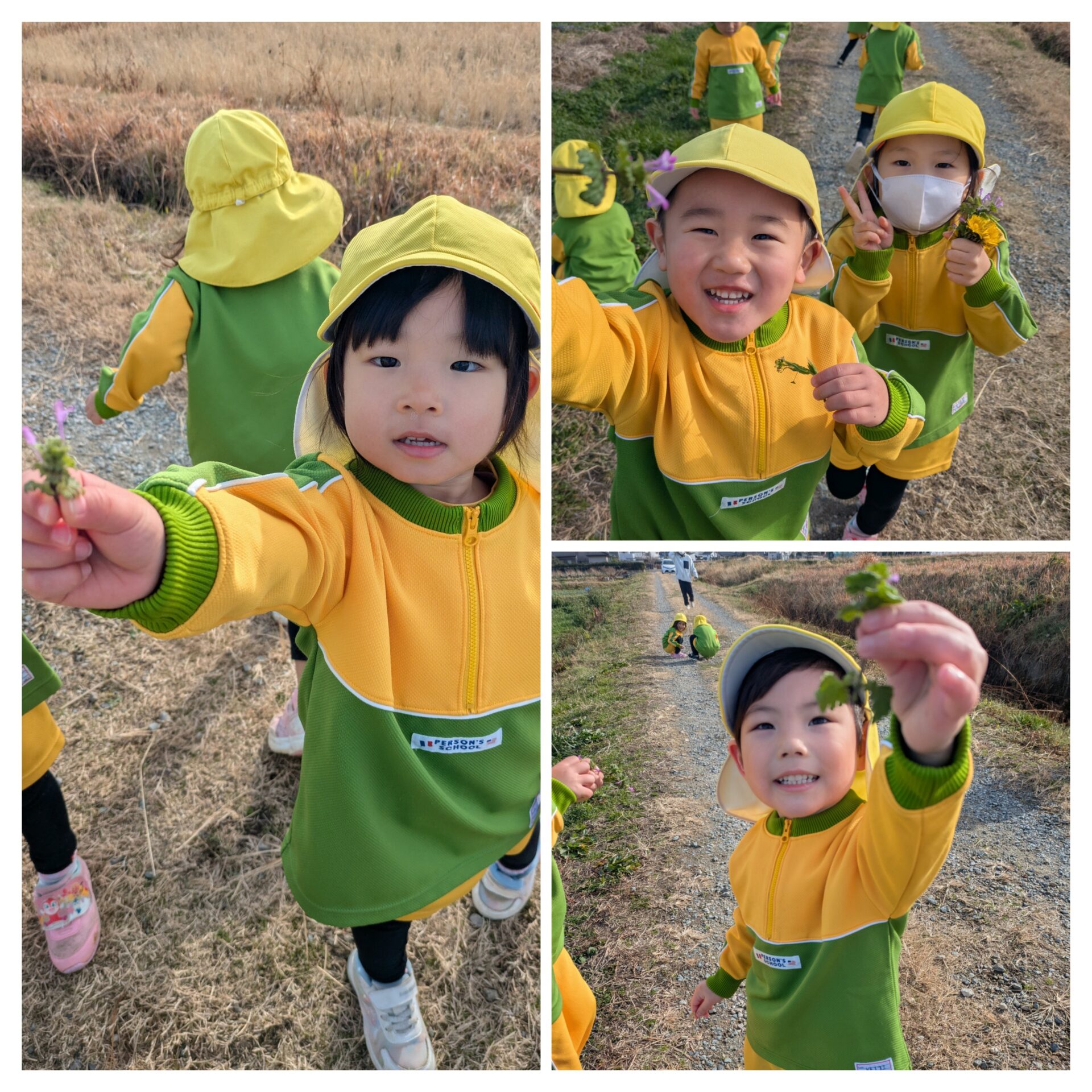 お散歩に行きました。「お家の人に見せる〜」とたくさんお花を摘んでいました😆