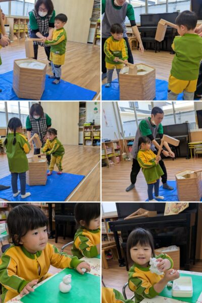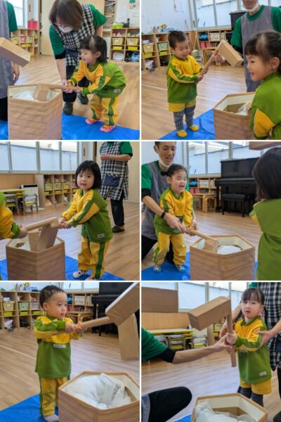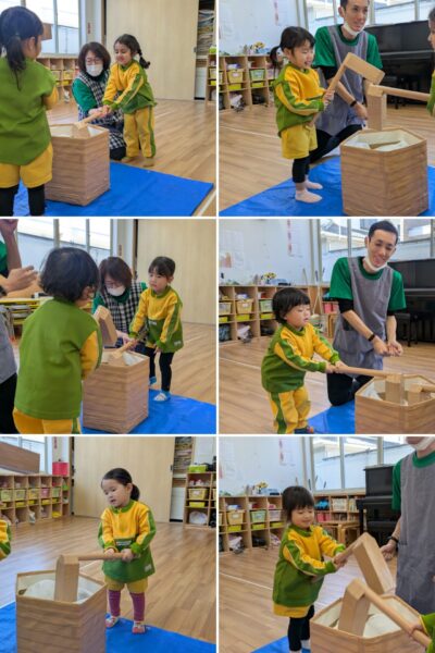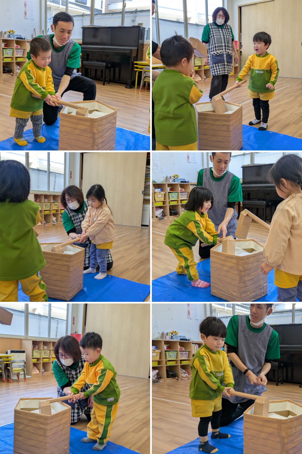 もちつきの由来や意味を聞いて、「ぺったん、ぺったん」と、もちつき遊びを楽しみました😄