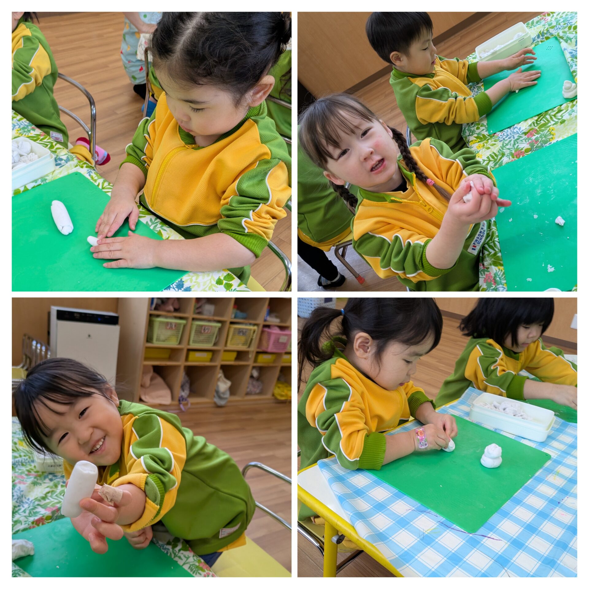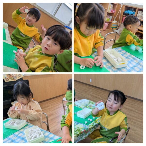 丸めたり伸ばしたりして色々なお餅ができました😃