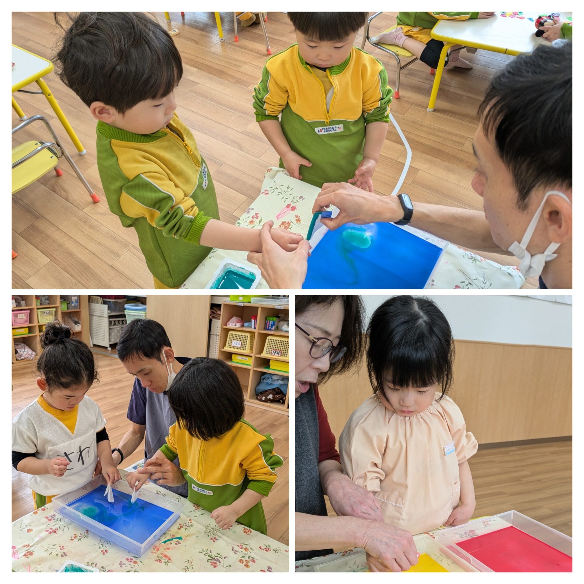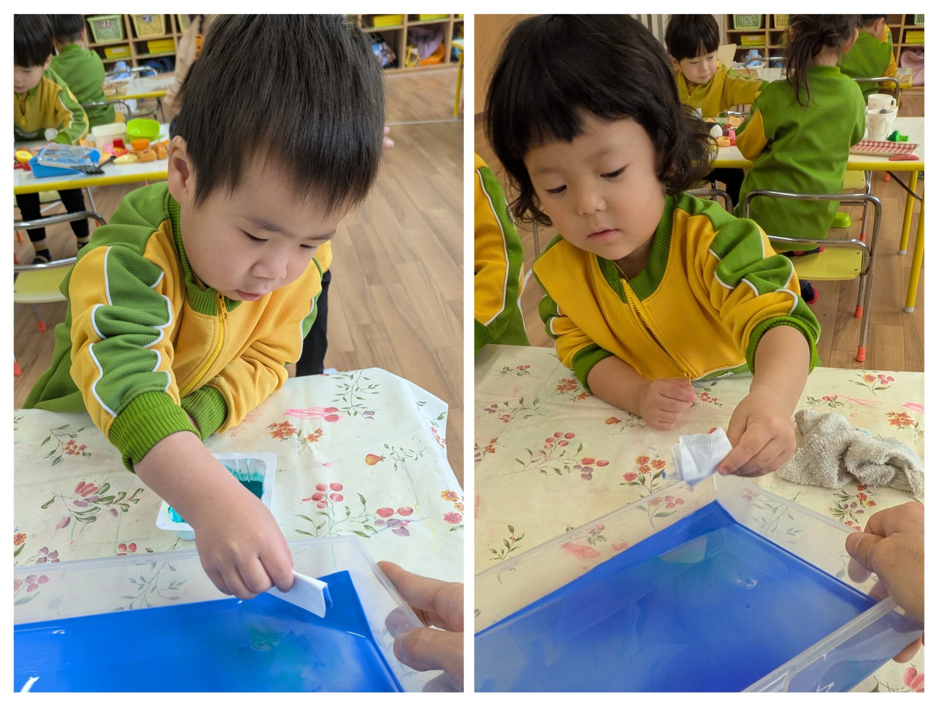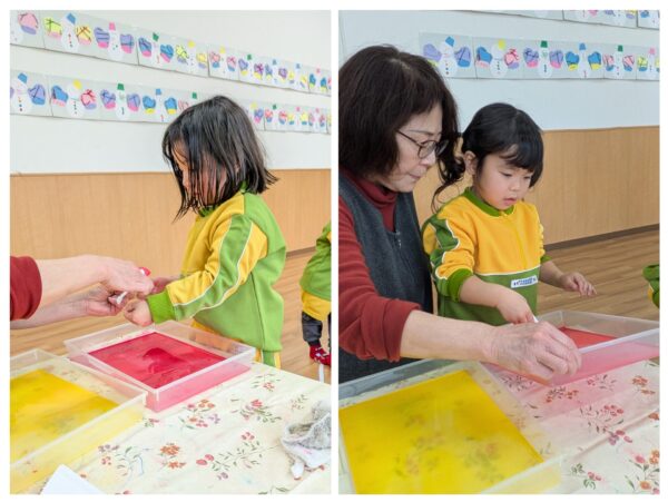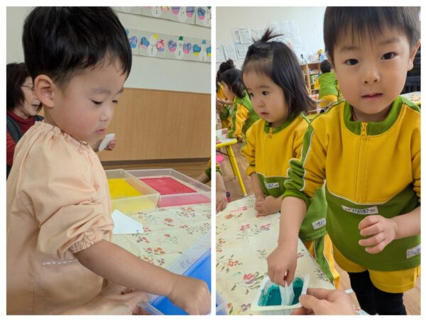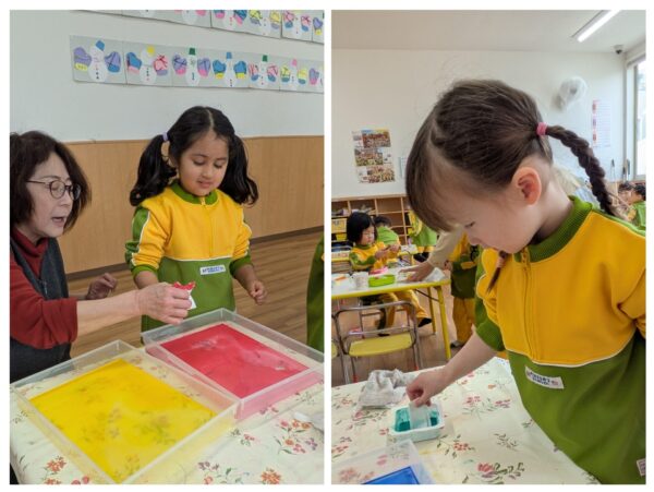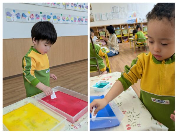 コーヒーフィルターに絵の具を浸し、色が染まっていく様子を不思議そうに眺めていましたよ。