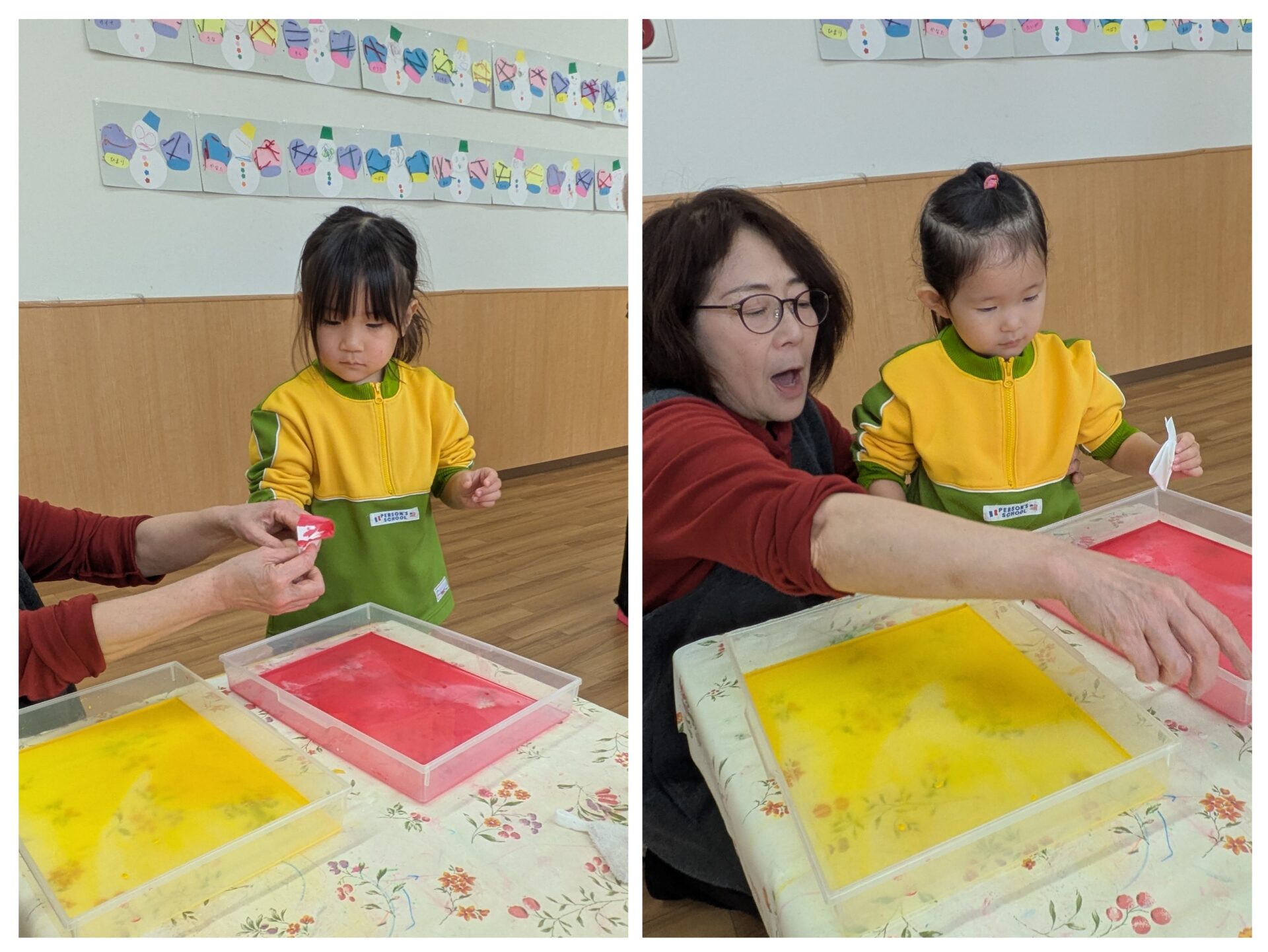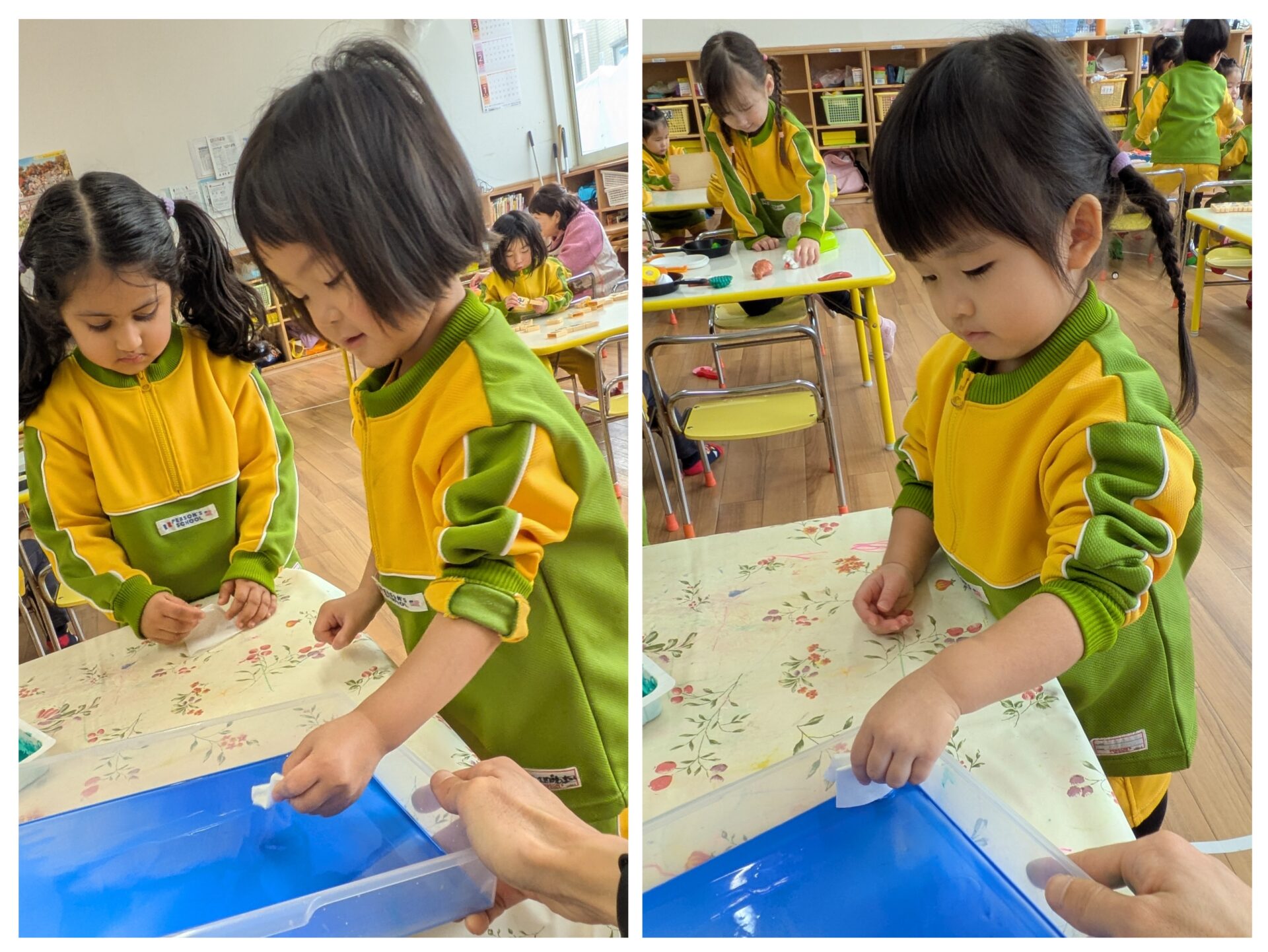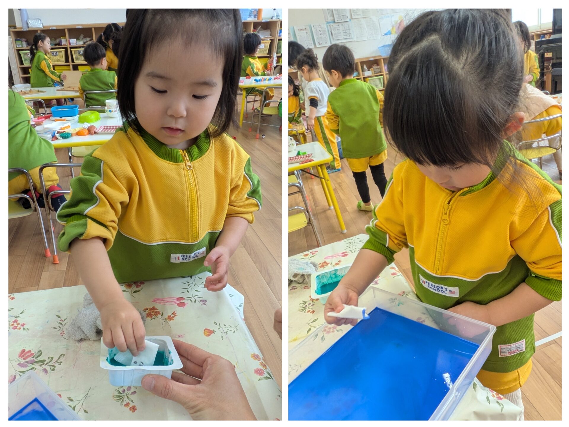 コーヒーフィルターに絵の具を浸し、色が染まっていく様子を不思議そうに眺めていましたよ。