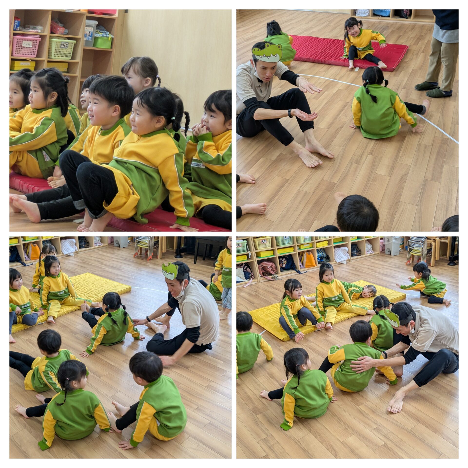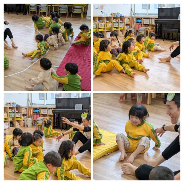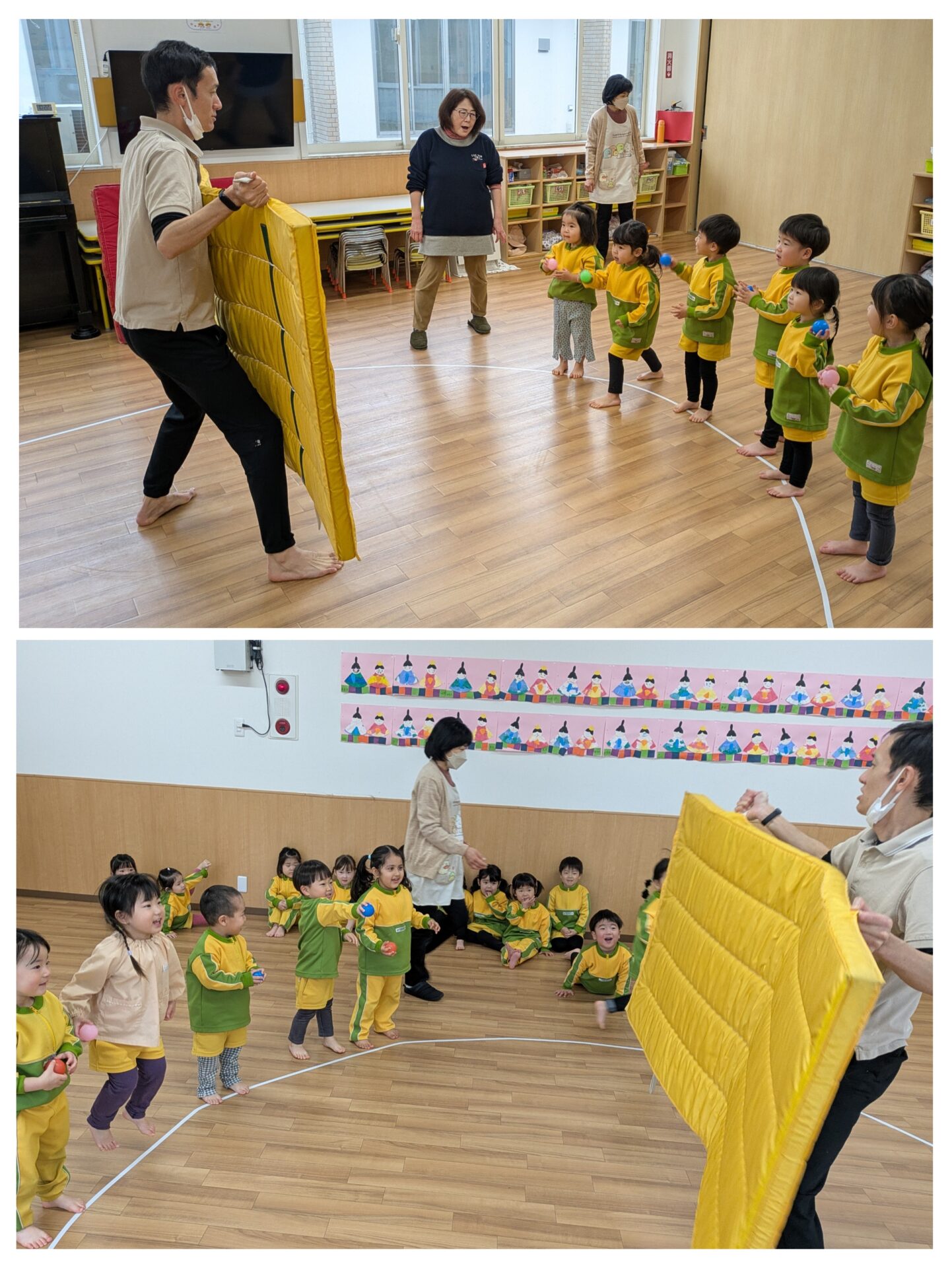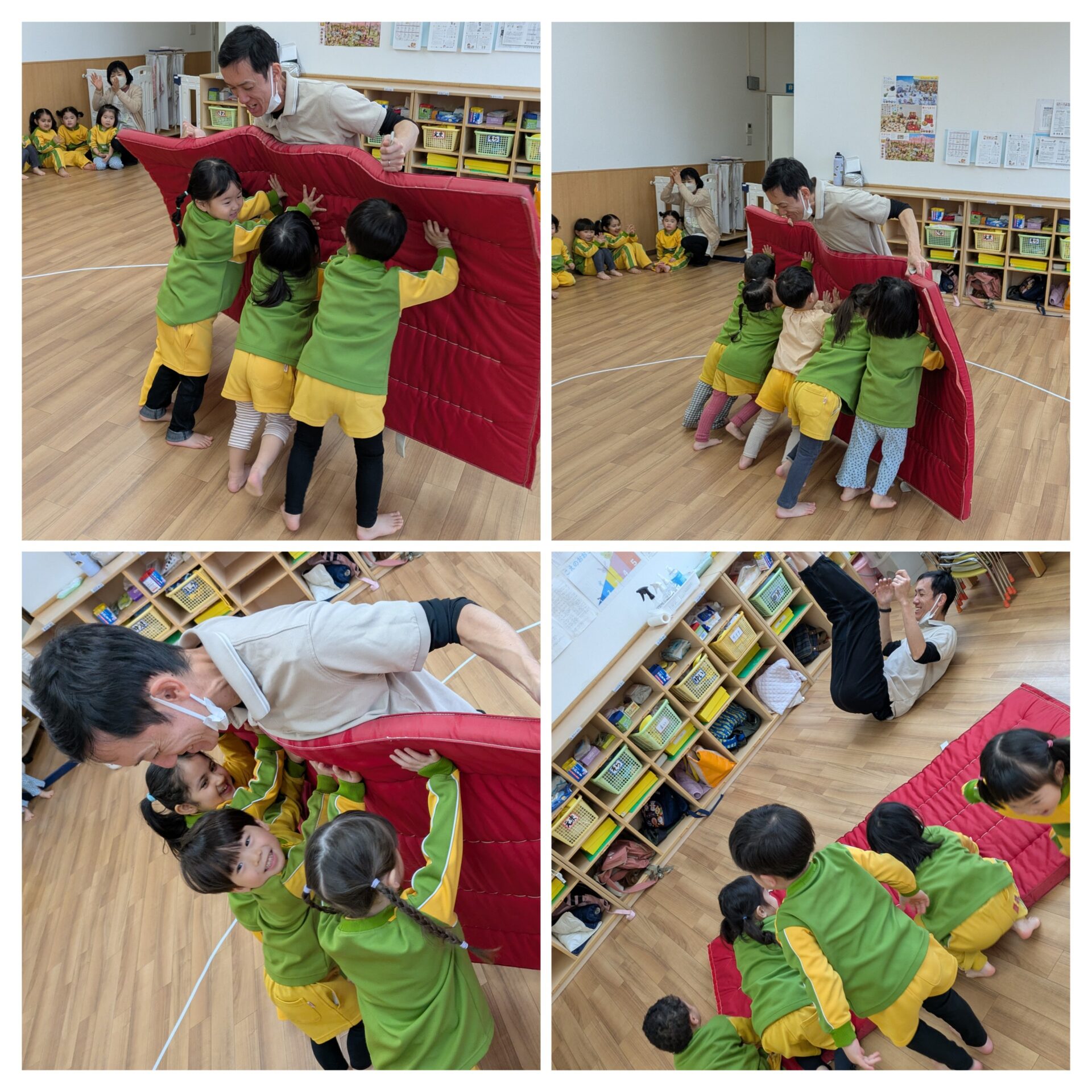 ちゅうりっぷ組 運動遊び 今日はマットとボールを使って運動遊びをしました。 ボールを投げてマット怪獣をやっつけろ! 今度はマット相撲!先生に負けないように力強く✨ 最後はお尻歩き鬼ごっこ。 ワニさんに捕まらないように島から島へお引越しするよ😃