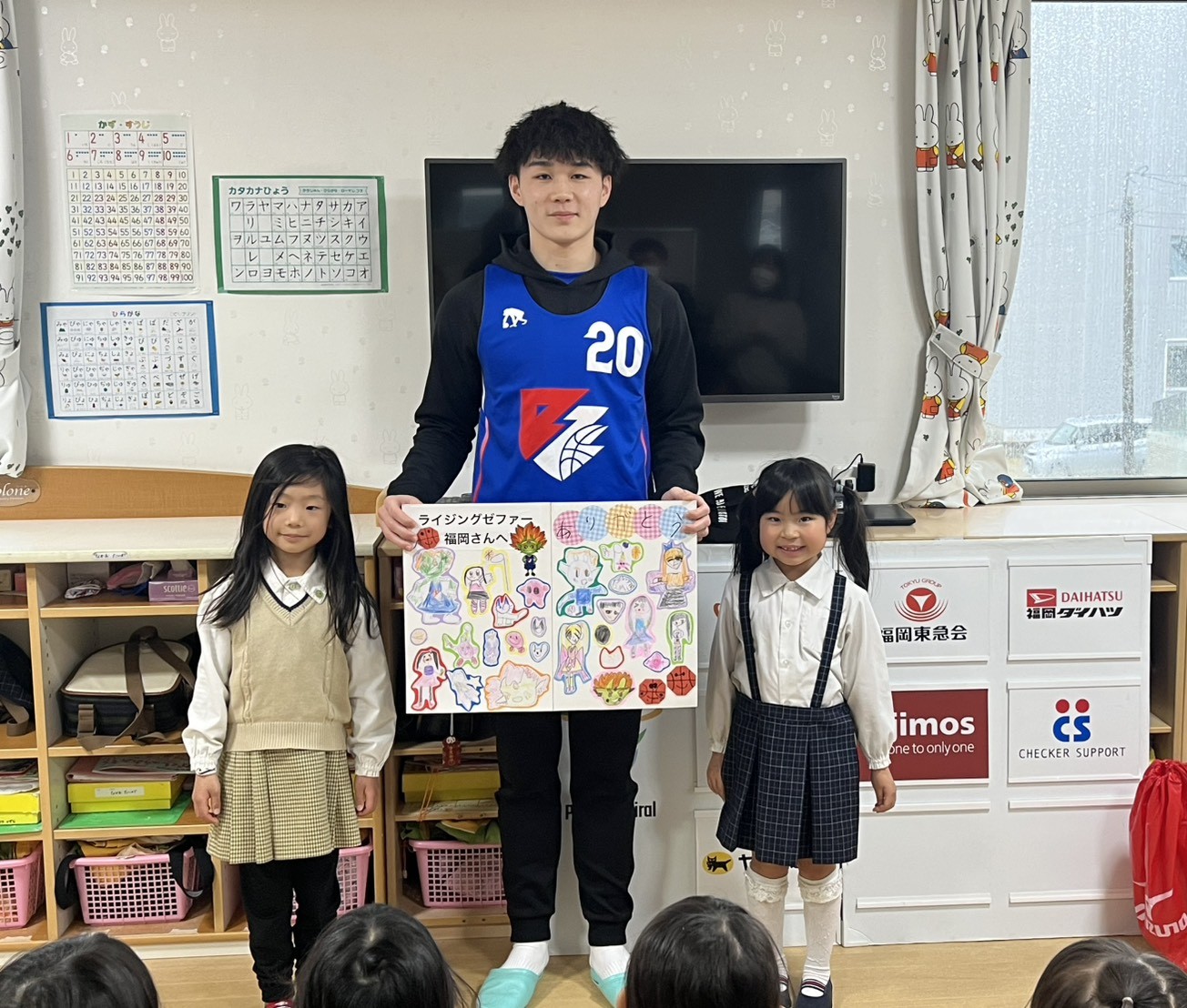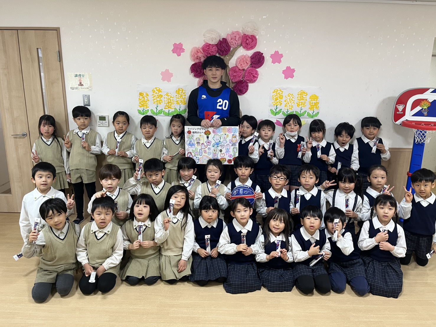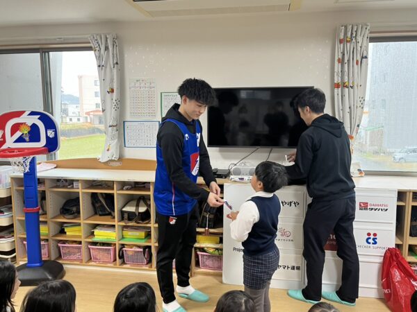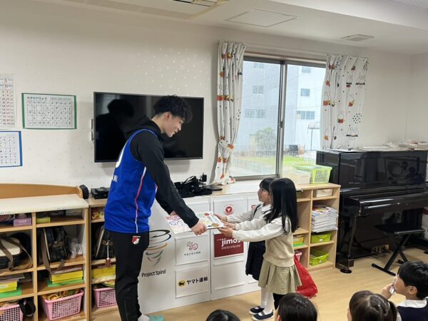以前ライジングゼファ福岡のシュートチャレンジに応募していたところ、何とキッズドリームが1位✨だったそうで、中谷選手が来園され、記念品をいただきました!