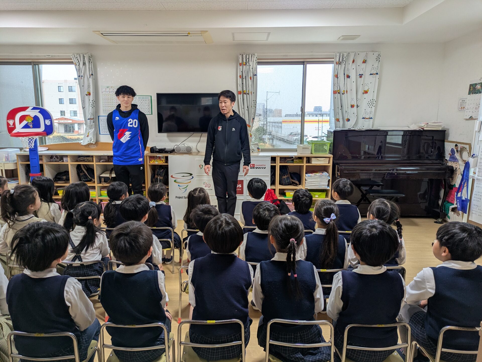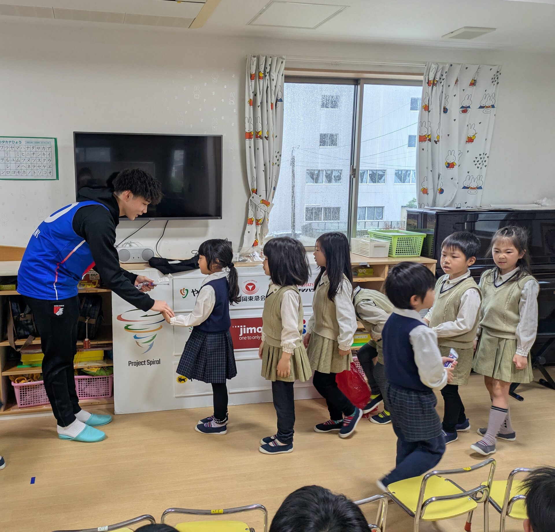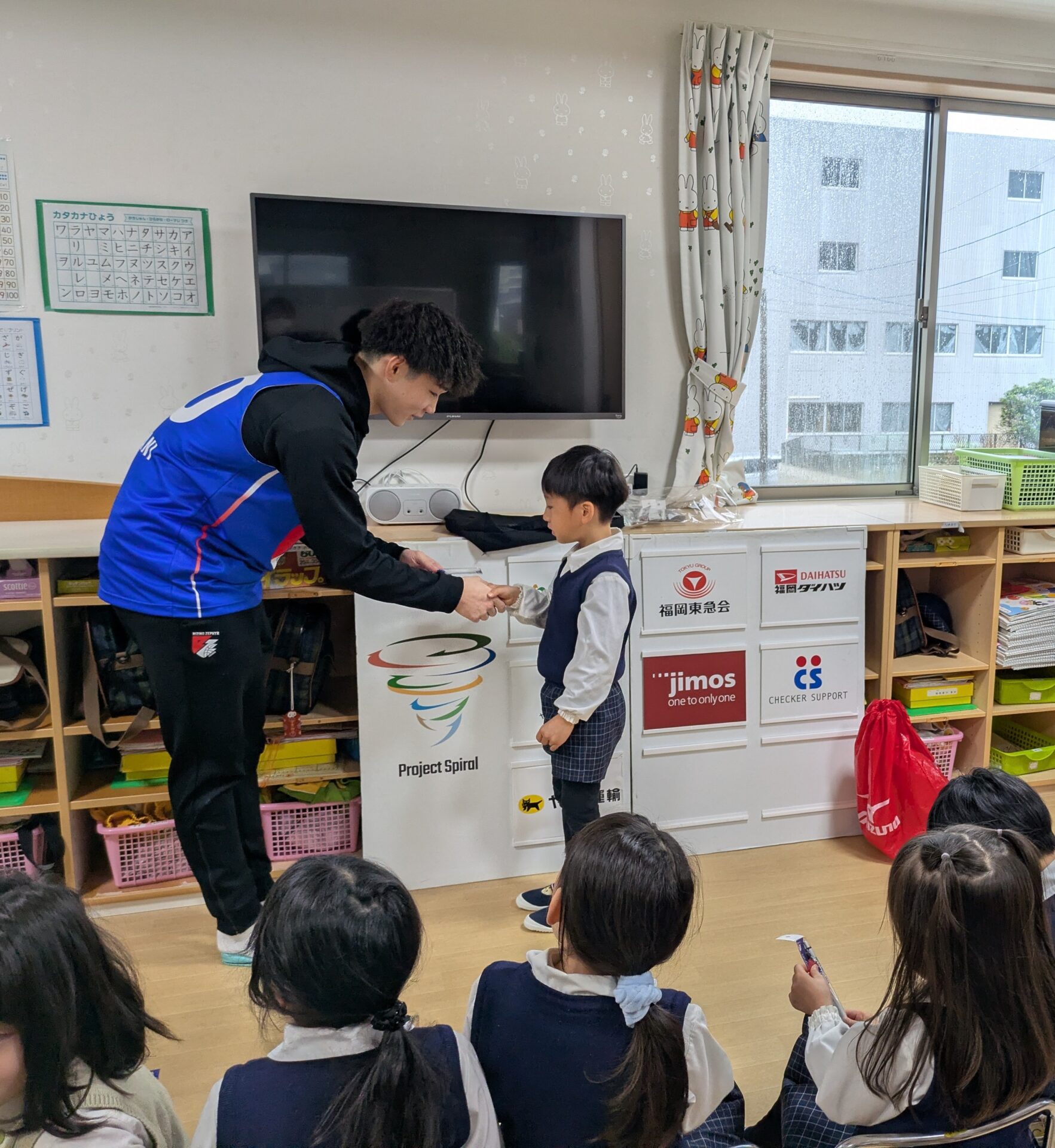以前ライジングゼファ福岡のシュートチャレンジに応募していたところ、何とキッズドリームが1位✨だったそうで、中谷選手が来園され、記念品をいただきました!