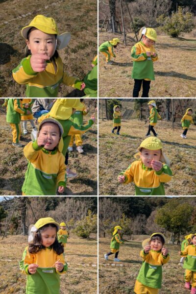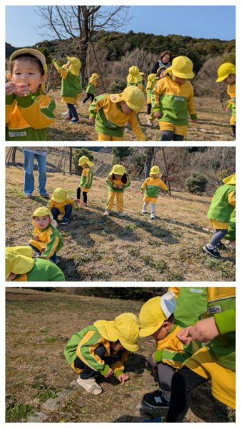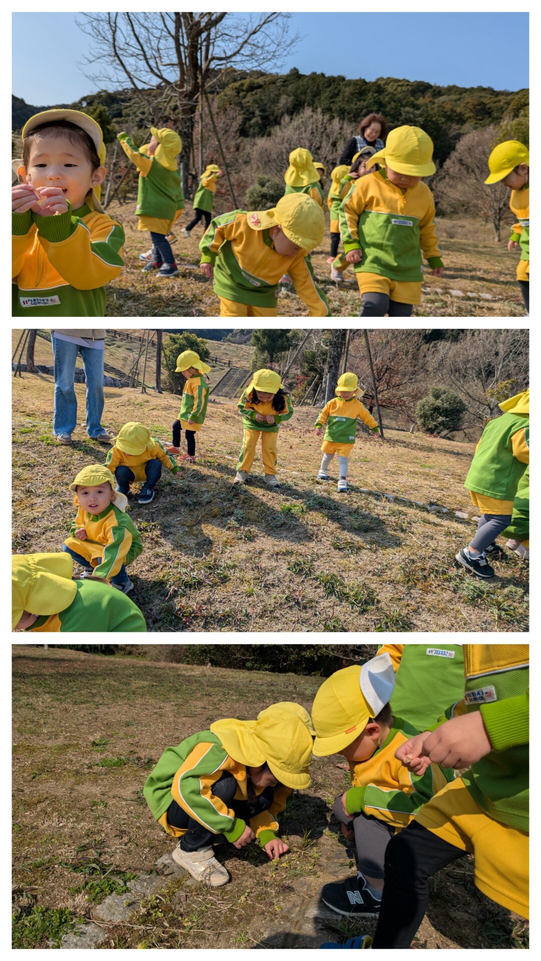 ちゅうりっぷ組 散歩 今日は初めて旅石公園まで散歩に行きました。 手つなぎ歩きもかなり上手になってきましたよ。 公園では、つくしを見つけると「つくつくつっくん♪」と『つくしのぼうや』の歌を口ずさむ子どもたち。 つくしを拾って大喜びでした😄 最後にみんなで写真を撮りました😄