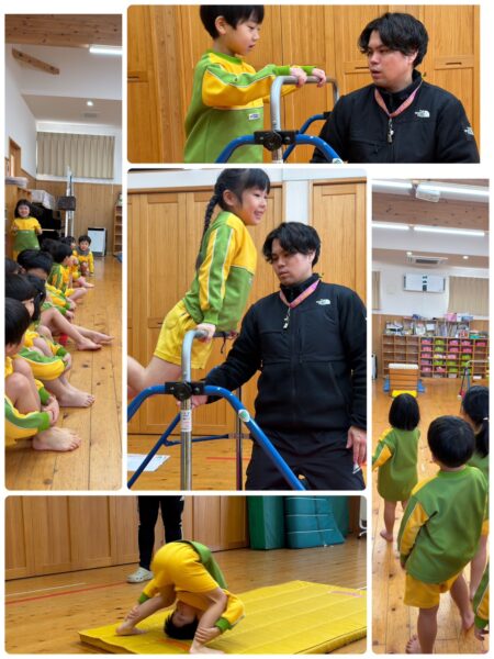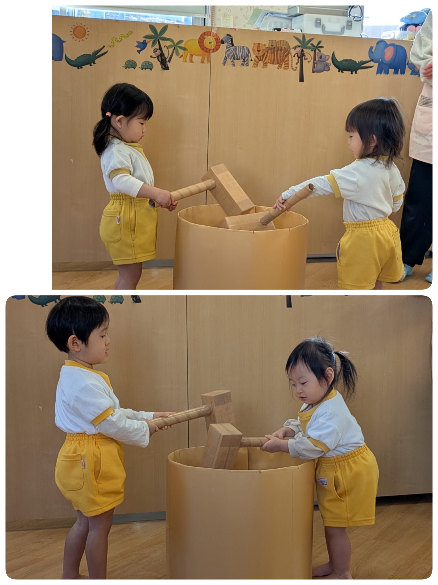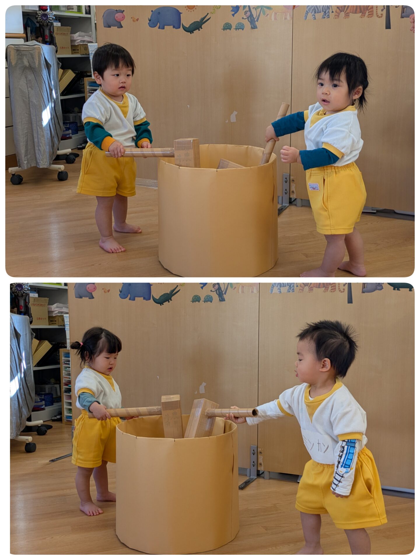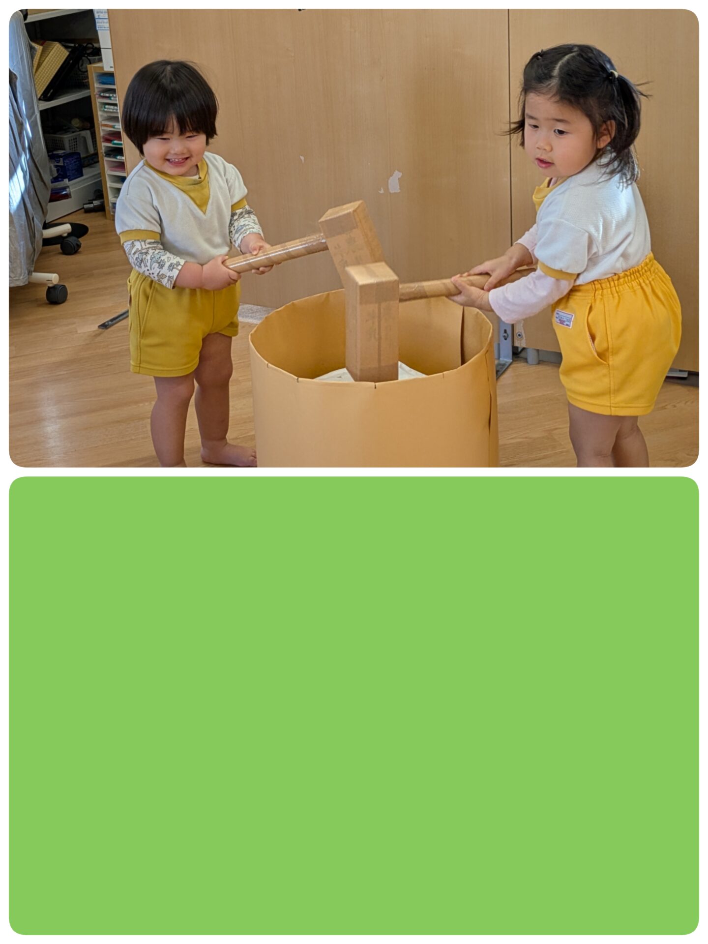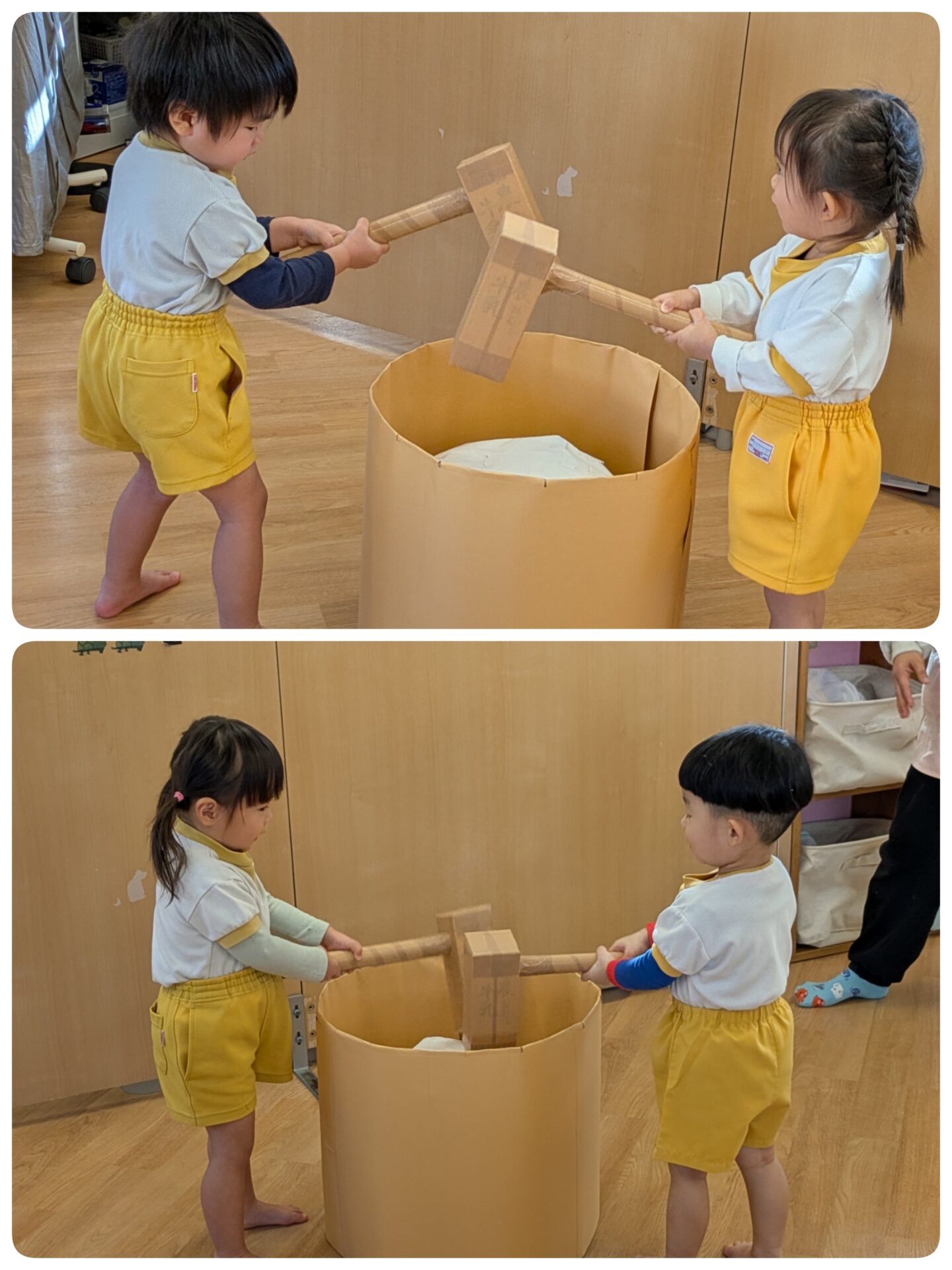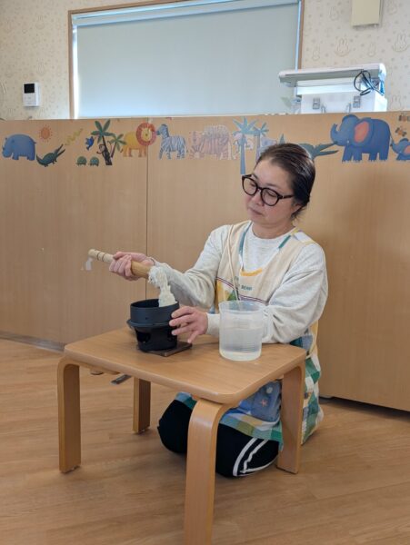 1月9日(金)ゆめのたね 今日は、もちつきごっこをしました。 ペープサートを見たり、もち米とお米の違いをみました。 「ぺったんぺったん」、もちができる様子をみて、驚いていました。 また、きねを持ち、「ぺったんぺったん」、上手についていましたよ。 その後は、小麦粉粘土で、鏡もちを作ったり、丸めたりして楽しく遊んでいました。