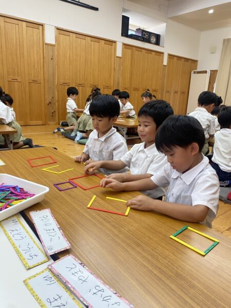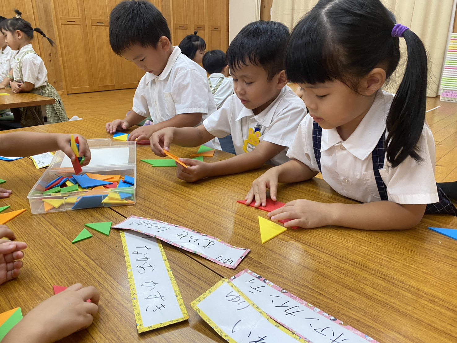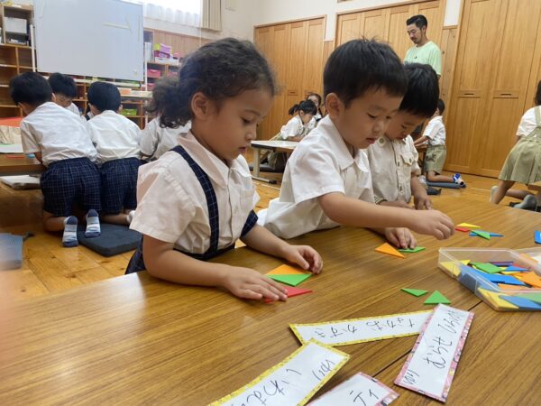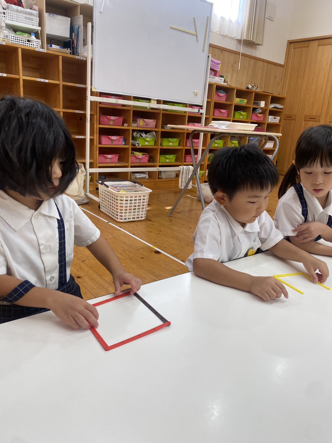 先日のこぐまでは、形を作ってお勉強しました😊三角2つで四角になる事に気づきました!