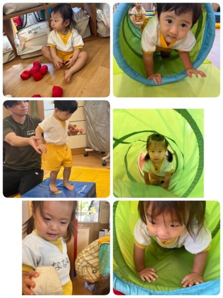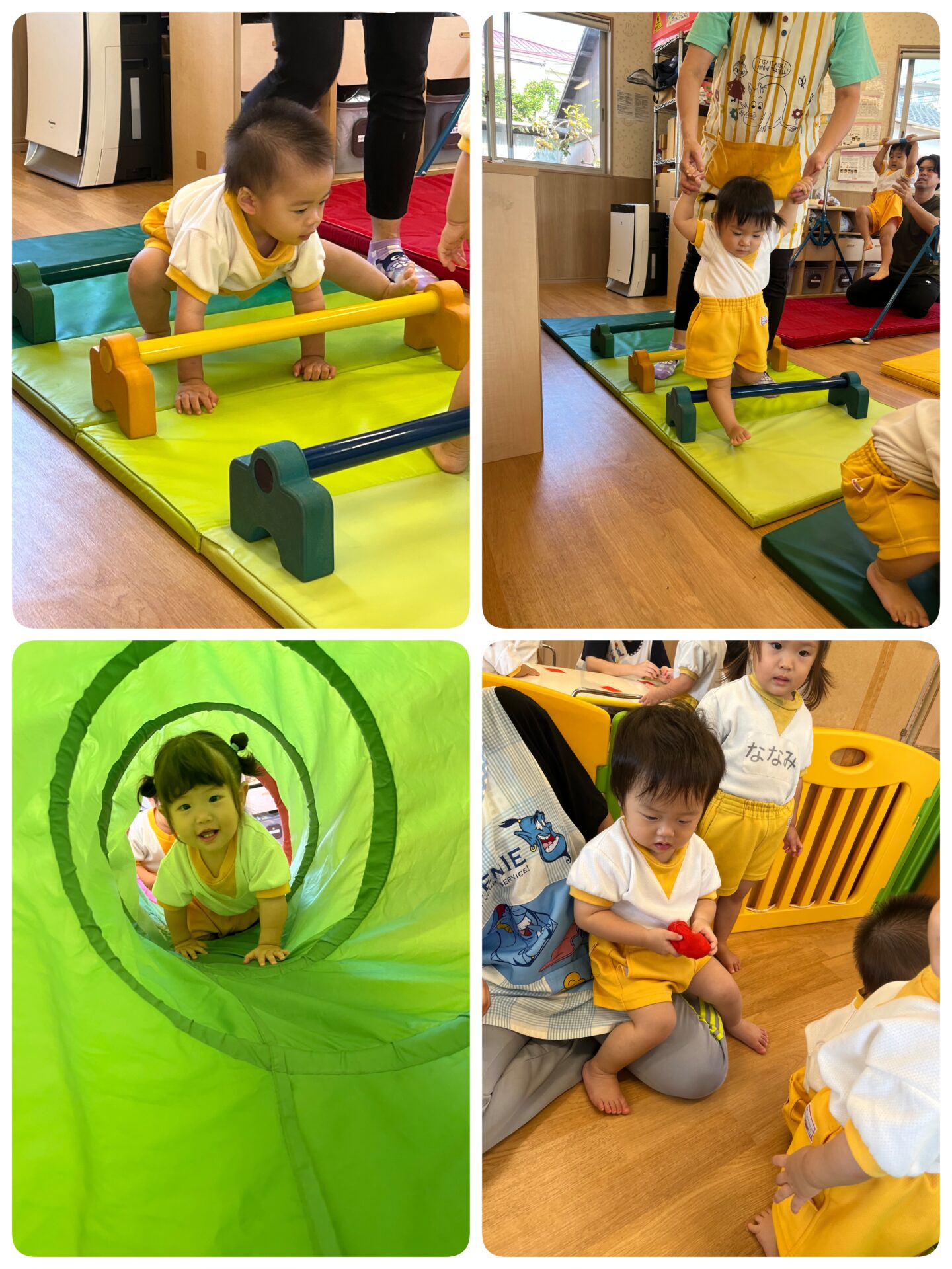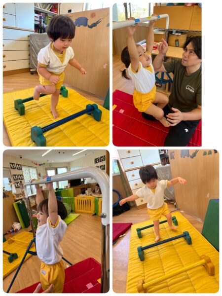 今日は、体操教室がありました。鉄棒にぶら下がったり、トランポリンに乗ったり。各クラス、楽しそうでしたよ。