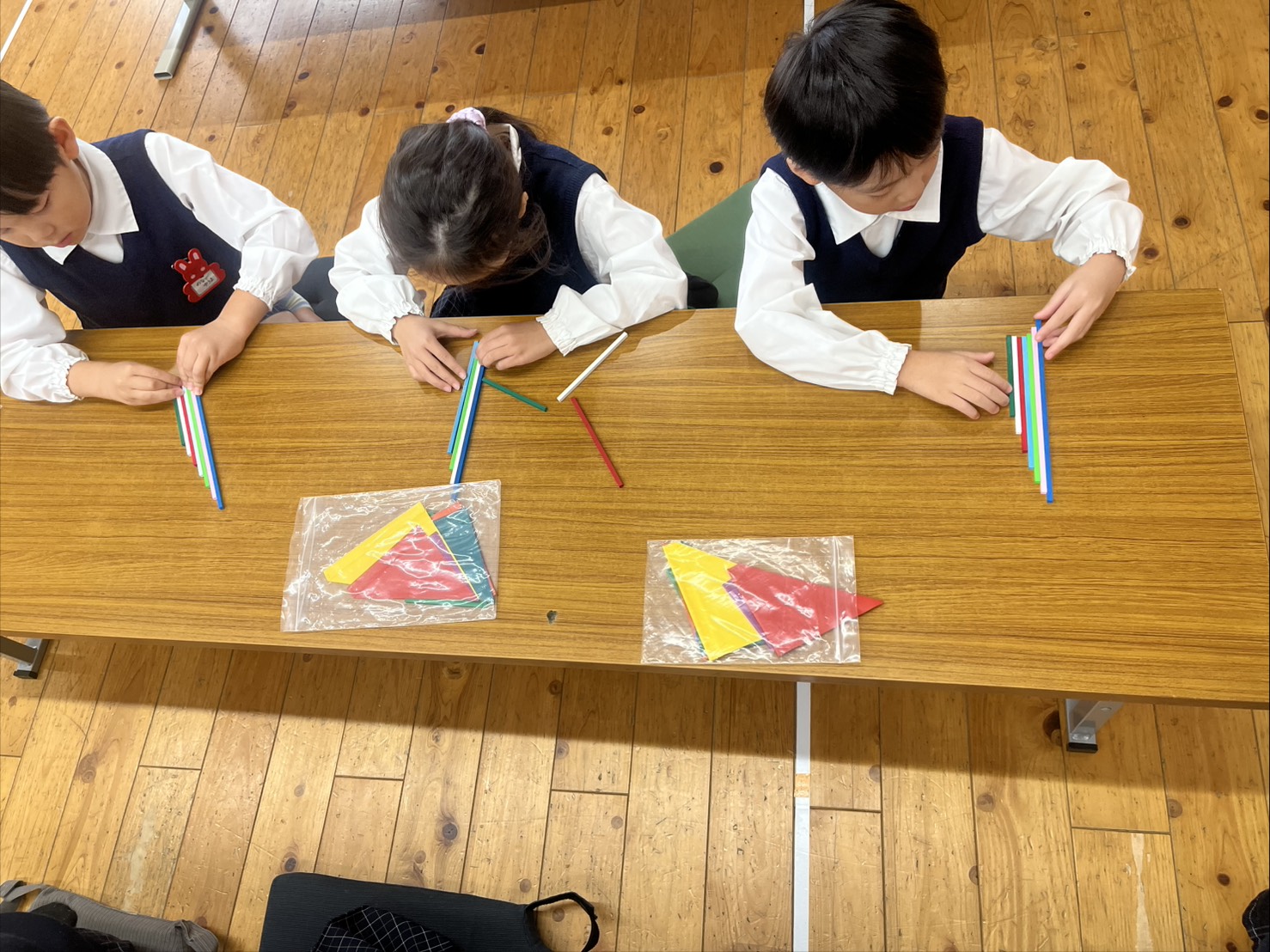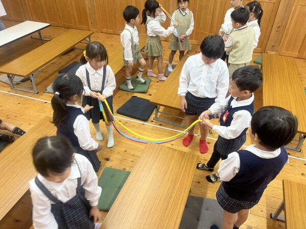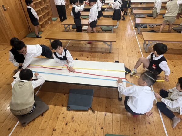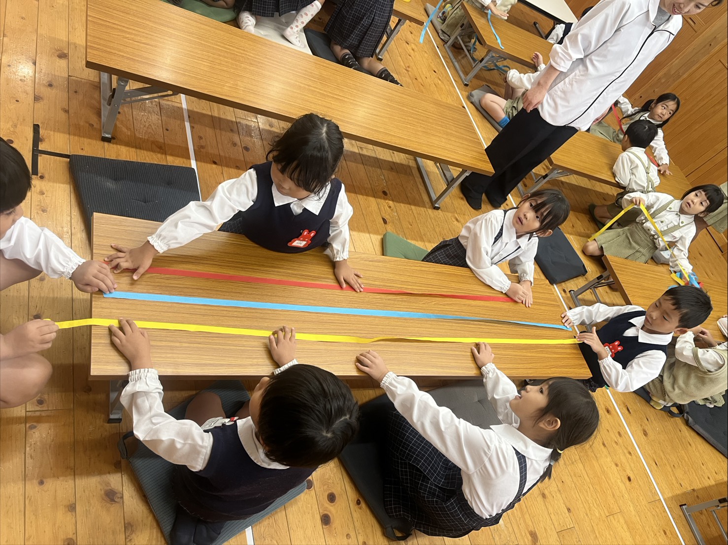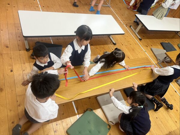 こぐまで長さ比べをしました!グループで協力して紙テープの長さを比べています。