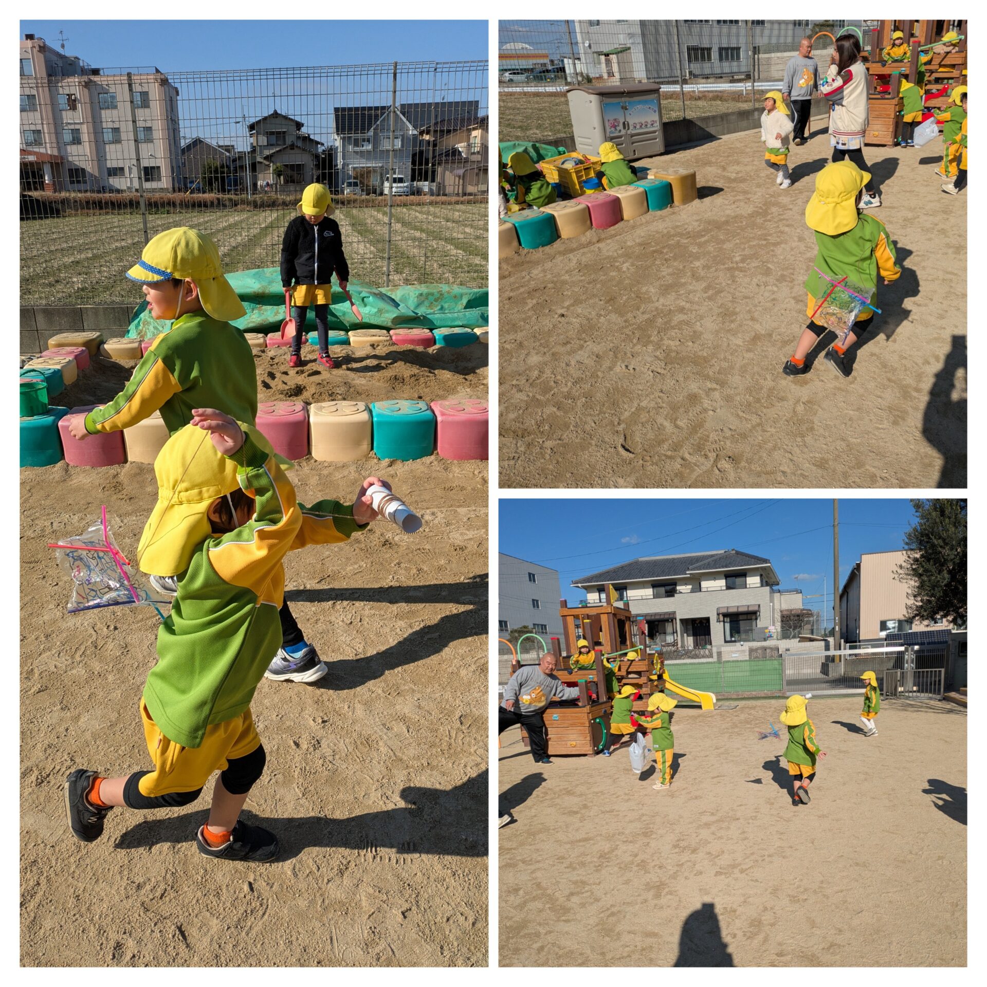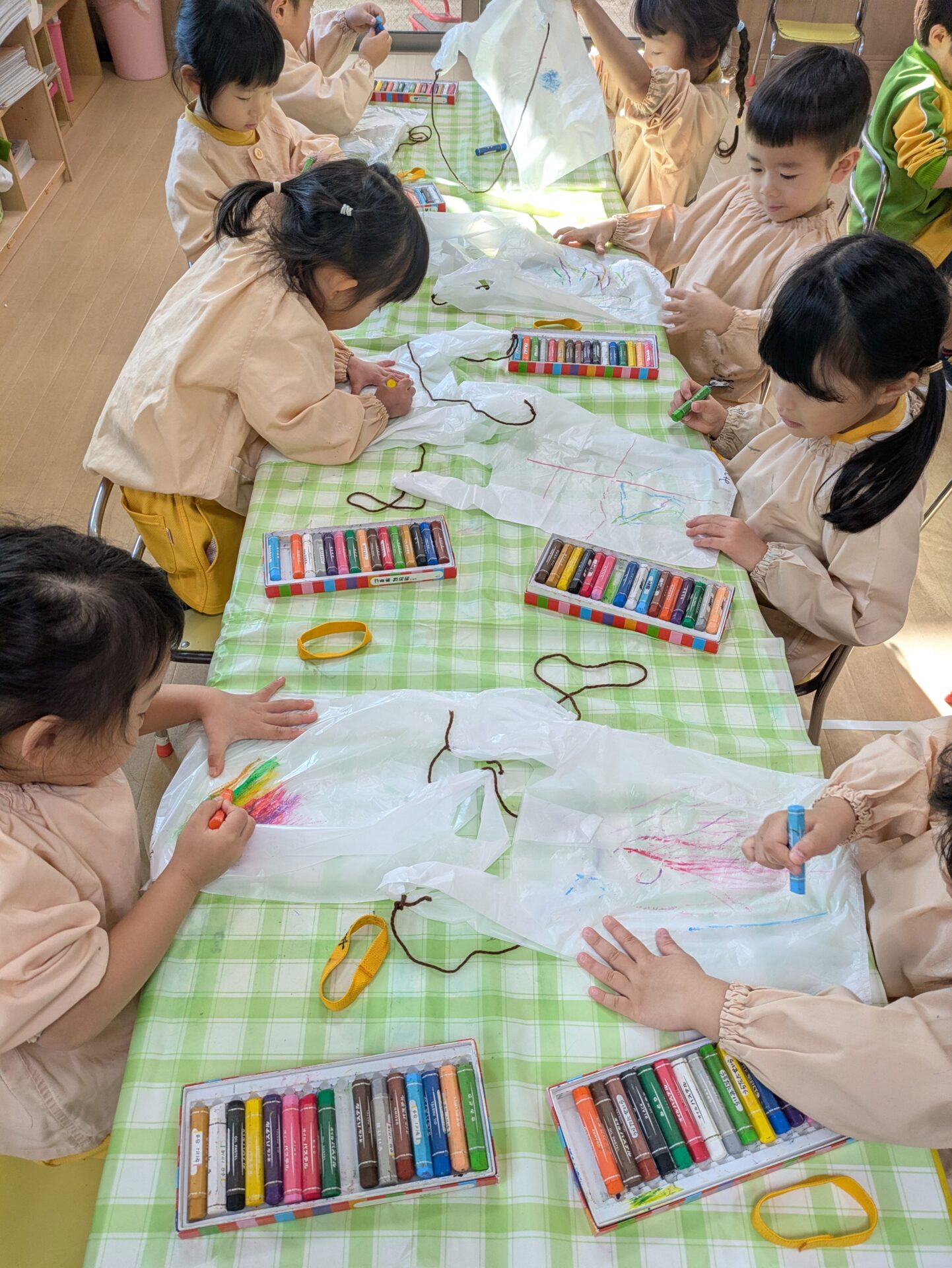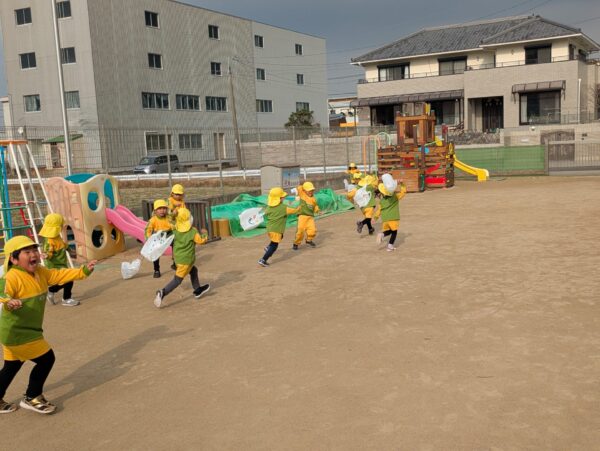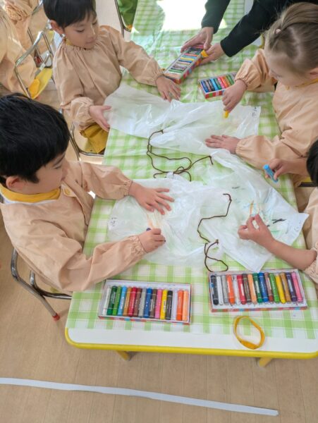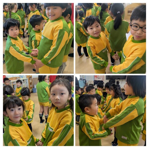 今日はふじ組、ゆり組と一緒に遊びました😊お兄さん、お姉さんたちと2人組になり嬉しそうなうめ組さんでした❤️ そして、たこ作りにも挑戦しました😊