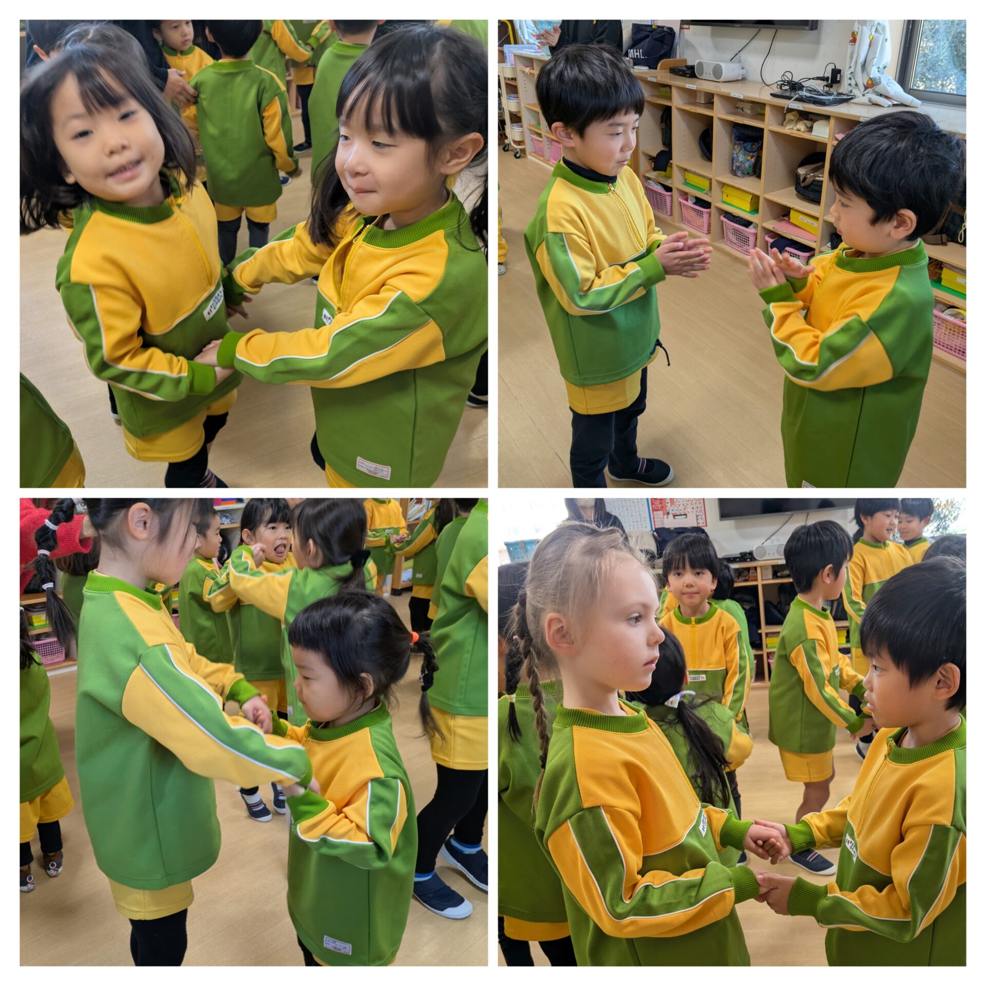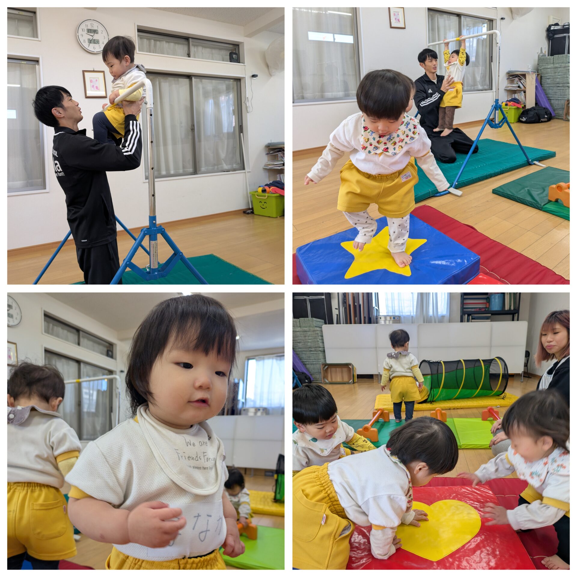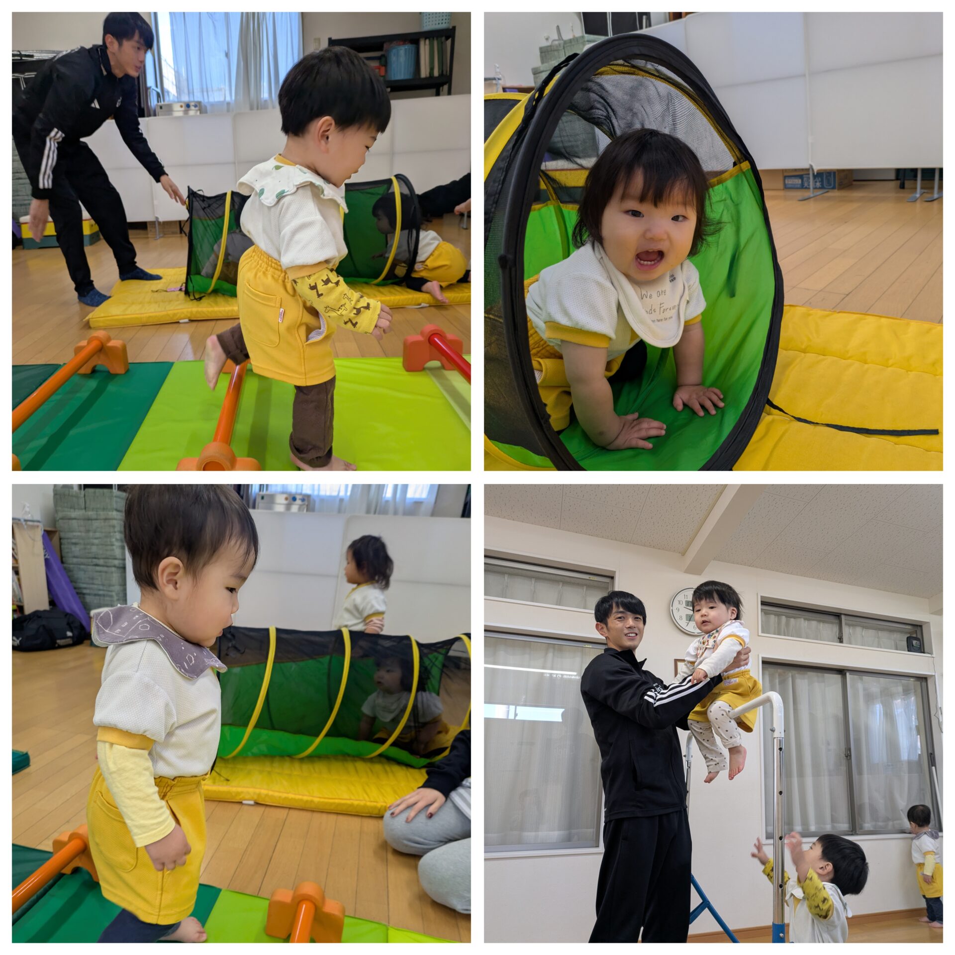 今日はふじ組、ゆり組と一緒に遊びました😊お兄さん、お姉さんたちと2人組になり嬉しそうなうめ組さんでした❤️ そして、たこ作りにも挑戦しました😊
