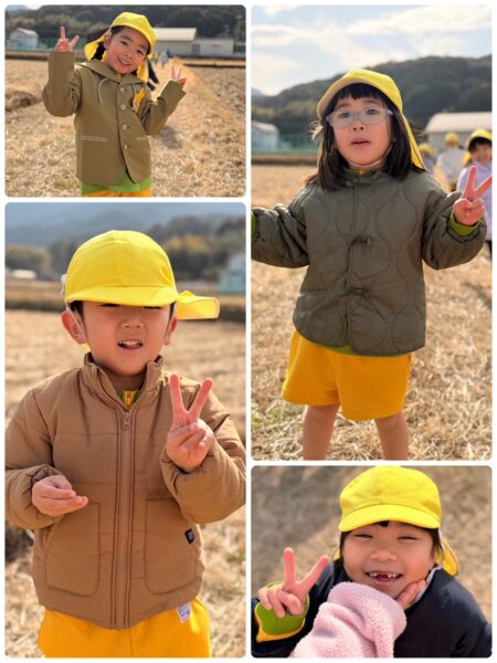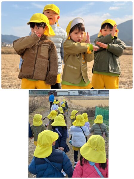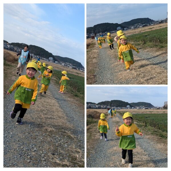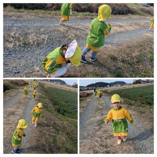 ちゅうりっぷ組 散歩 今日は明日と予定を入れ替えて散歩に行きました。 道中、畑では大根やブロッコリー等のたくさんの野菜を見つけ「大根大きいね」「ブロッコリー好き!」とたくさんお話しながら歩きました。 あぜ道でもお花を探したり走ったりしましたよ。